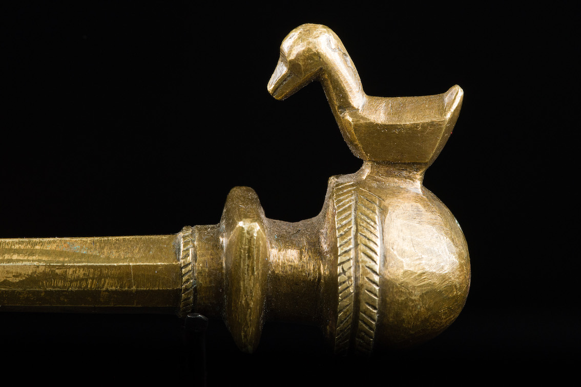 Description: Un ancien couteau en métal et bronze lié au sacrifice du zébu durant les cérémonies de circoncision. La lame à un tranchant est fixée dans une poignée en bronze décorée d'un zébu et d'un canard symbole de fécondité. Ce type d'objet pouvait servir pour toute une région. Il n'est pas courant d'en découvrir un en bon état.